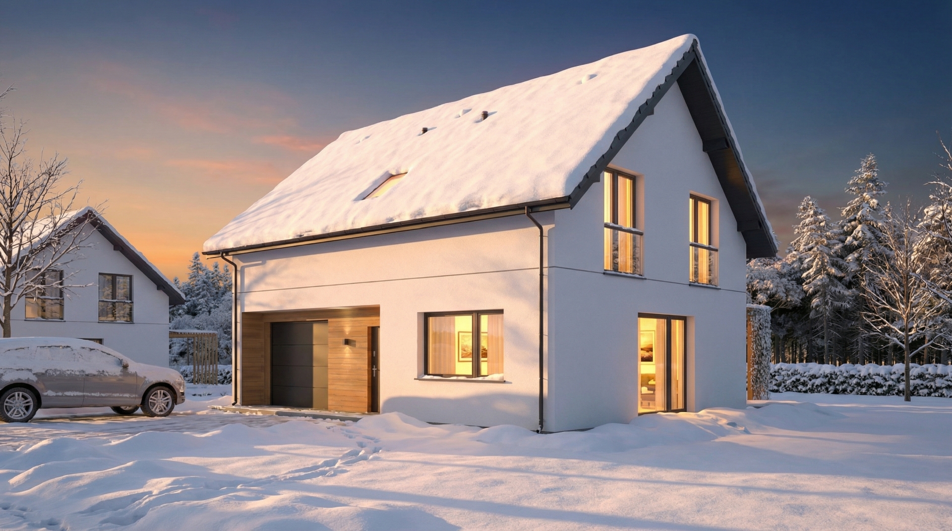Wersja zimowa pokazuje solidność i całoroczny charakter zabudowy.